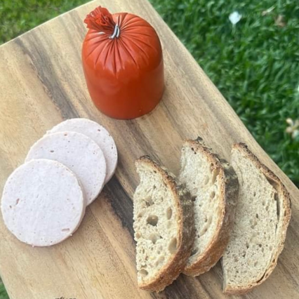 Lyoner sausage, also known as Lyonnaise sausage, is made from pork and is a type of French dry-cured sausage. The pork is trimmed and ground, then mixed with salt, pepper, and other spices. This mixture is stuffed into a casing and dried. Named after the city of Lyon in France, where it was first created, Lyoner sausage is known for its rich flavor and versatility, making it perfect for sandwiches or as a snack. It pairs wonderfully with one of our homemade Weggli!